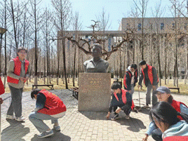 志愿者们擦拭了魏玉川雕像,对广场进行了全面而细致的清扫,对广场周边的自行车、电动车进行了整理。最后,志愿者们向魏玉川雕像鞠躬致敬,表达敬意和怀念。