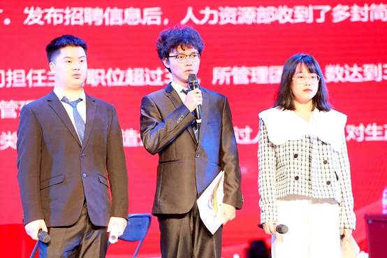 各参赛队伍围绕赛前组委会公布的主题和框架,结合人力资源管理专业知识,对人力资源人员招聘、劳动争议、绩效反馈面谈等核心职业情景进行分析设计,并通过团队角色扮演的方式进行演绎。