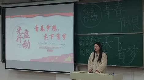 进行光盘并不仅仅是中华传统美德节约的传承,更是是国家发展、社会进步的精神需求和实际需要。古人教育我们忆苦思甜,所以我们时刻警惕,不忘来时之艰辛,方能保持艰苦朴素坚定向前。 团支书尚荣给同学们讲解“光盘行动”以及环保节俭的重要意义,台下同学专心致志地聆听,生怕错过每个细节。