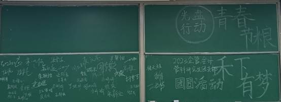 在知识竞答环节,同学们积极举手,踊跃抢答,让大家对光盘行动有了更深刻的认识。最后在经验成果分享会上,再次呼吁大家身为兰理学子,要做好“避剩客”的接力。同学们纷纷在黑板上签下名字,承诺做好“光盘行动”,反对铺张浪费。