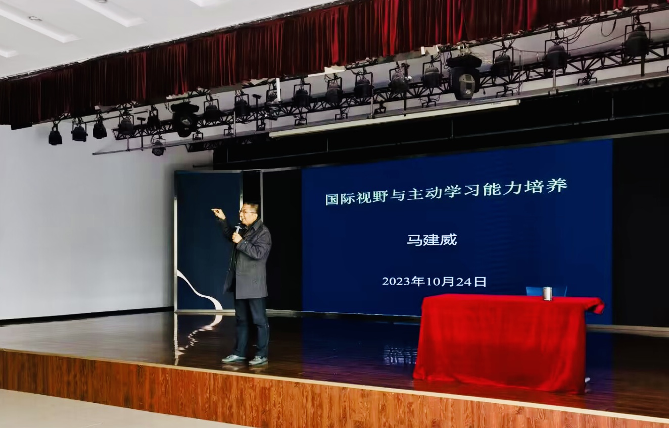 马老师以《国际视野与主动学习能力培养》为题,从党的二十大报告中要坚持教育优先发展、科技自立自强、人才引领驱动讲起,引出了国际视野的概念,并对具备国际视野所需的全方位思考、明辨能力、信息获取、文化包容、多元思维、跨文化交流、国际竞争力等进行了详细阐述,针对如何培养国际视野,提出了转变学习者的理念、培养批判性思维、发展文化胜任力、促进跨文化讨论达成、清晰文化的求同存异等建议,马建威教授建议同学们要加强主动学习能力,提出跳出舒适区、提升学习力。