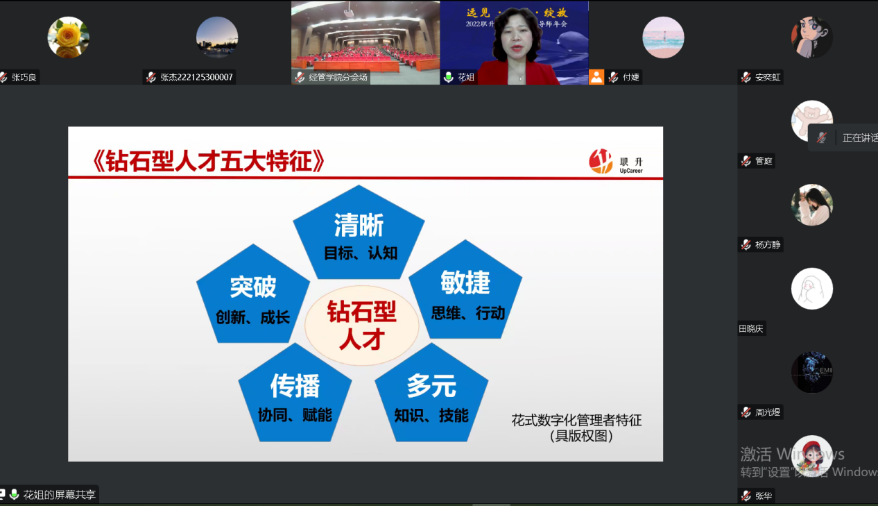 严明花女士在对老员工就业环境现况、企业需求应届生具备哪些能力、应届生被拒的10大原因、应届生如何画好就业大蓝图的基础上,根据她首创的钻石型人才五大特征,为同学们做了如何成为钻石型人才、赢在职起线的主题报告。