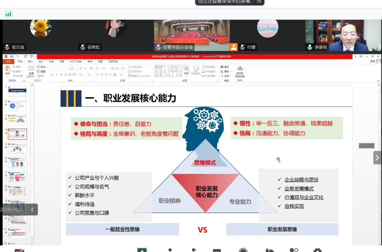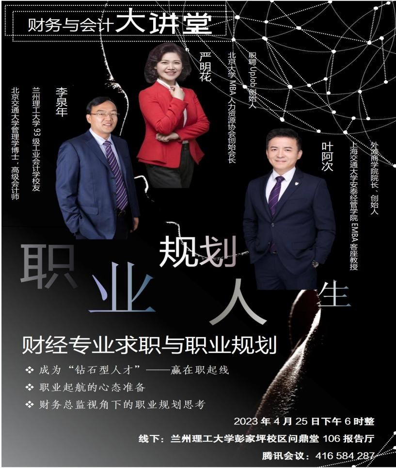 为深入贯彻落实习近平新时代中国特色社会主义思想主题教育,推动公司毕业生充分和高质量就业,2023年4月25日,应gg999策略手机白菜的邀请,公司93级工业会计学员工李泉年博士为公司财务管理和会计学专业的同学在线举办题为《财经专业求职与职业规划》的学术讲座,李泉年还邀请了外滩商公司经理、创始人、上海交通大学安泰gg999策略手机白菜EMBA客座教授叶阿次博士,以及职聘UpJob创始人、北京大学MBA人力资源协会创始会长严明花女士一起做专题报告。何卫平教授作为93级班主任全程参与了报告。公司王翀副书记主持了报告会,并对公司访企拓岗工作进行了推介。