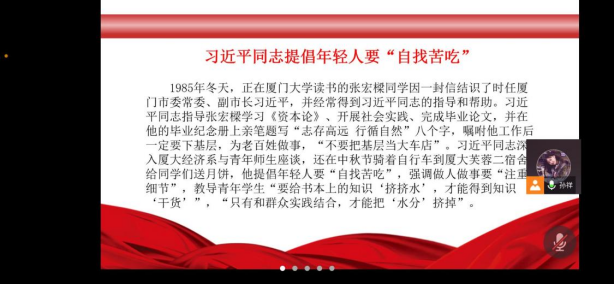 主讲人孙祥通过引用习近平总书记“年轻人要‘自找苦吃’”“老老实实地调研”等金句,告诫大家在日常学习和工作生活中要脚踏实地,行稳才能致远,并鼓励大家牢记习近平总书记的教诲,努力实现自我的人生理想与价值。