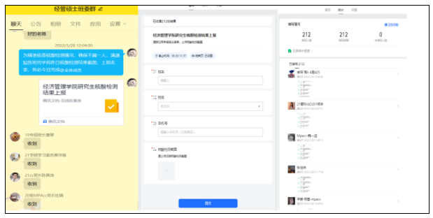 核酸检测结束后,利用腾讯文档方式统计汇总核酸检测结果,并截图上报表单,辅导员逐个审核,确保应检尽检,数据精准。