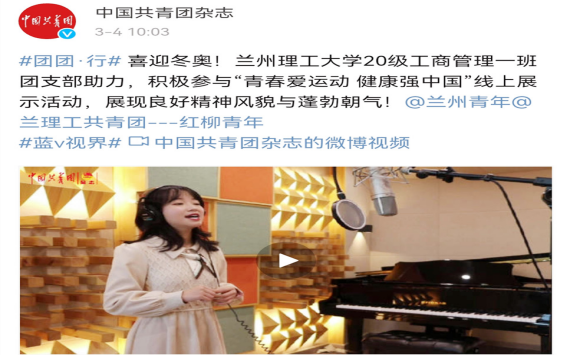 ①2020级工商管理团支部助力冬奥社会实践活动“我为冬奥加油”MV视频被《中国共青团》杂志官方微博推广宣传,展现了兰理共青团红柳青年蓬勃向上的精神风貌。