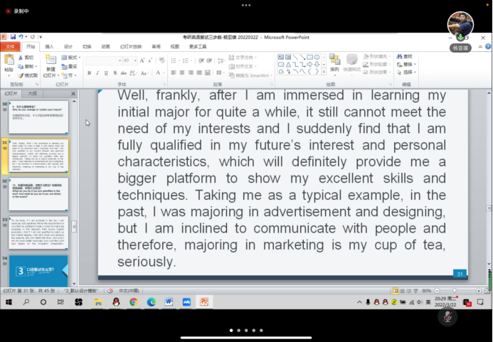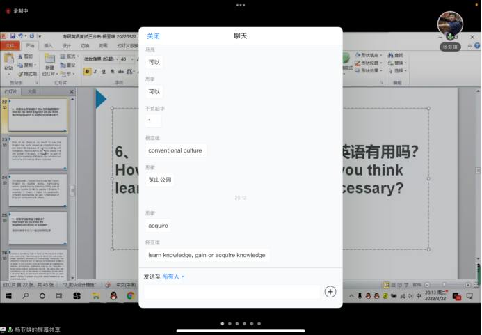 杨亚雄老师常年从事英语教育培训工作,在考研辅导、英语复试等方面积累了丰富的经验。杨老师语言诙谐幽默,先就考研英语复试的基本情况分地区向大家作了简要通报,后以考研英语复试为主题,从“英语复试类型”、“口语复试怎么考”、“口语复试怎么答”三个模块进行讲解,同时针对考研英语复试实际遇到的问题,介绍了一些口语复试常用的高级词汇,举了一些诙谐幽默的例子。在自我介绍环节老师着重强调了员工应该多涉及与自己专业有关的事,不能侧重赘述一些琐碎的生活事件,进行了演示和说明。培训过程中,杨老师将培训过程中的重难点词汇列示在了聊天界面供大家学习,并强调了复试重要技巧,如“说好简单句”、“增强词汇的表现”、“内容为主(不要抄袭) ”等。培训结束后,杨老师还就大家提出的日常疑惑进行了耐心解答,现场互动频繁,气氛热烈,大家受益匪浅。