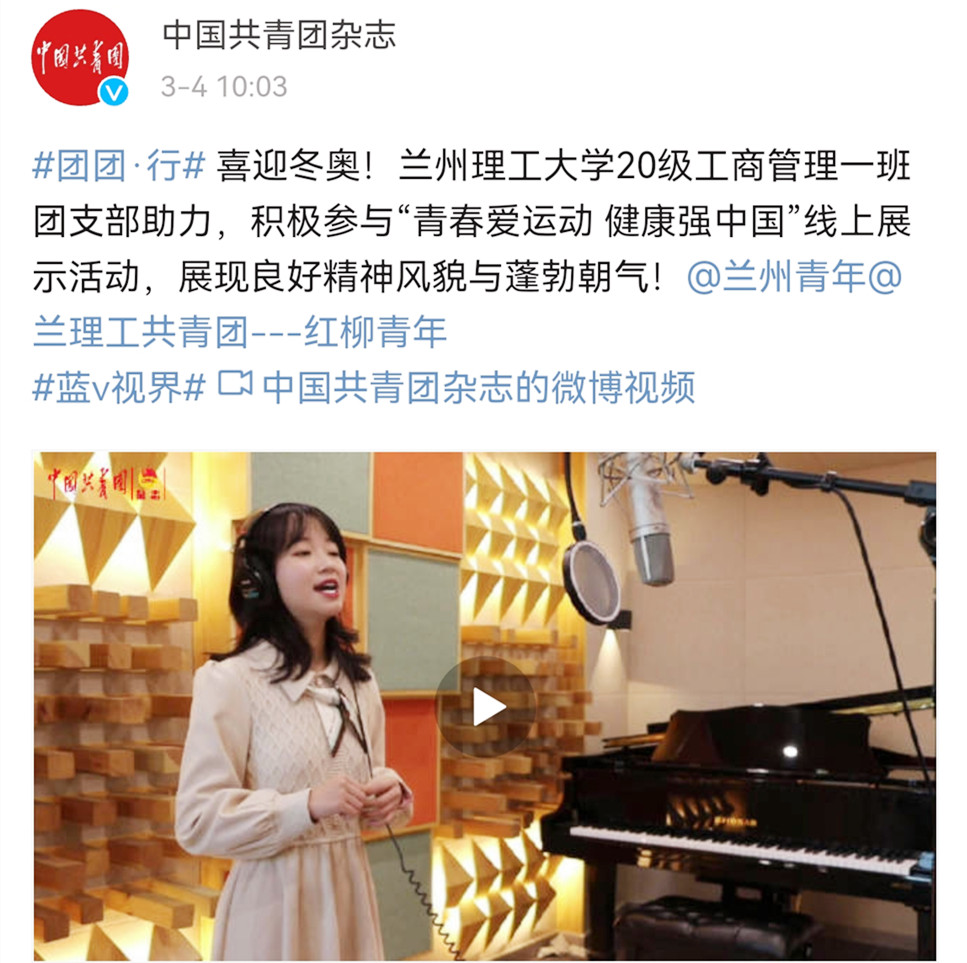 近日,20级工商管理团支部助力冬奥社会实践活动“我为冬奥加油”MV视频被《中国共青团》杂志官方微博推广宣传,展现了兰理共青团红柳青年蓬勃向上的精神风貌。