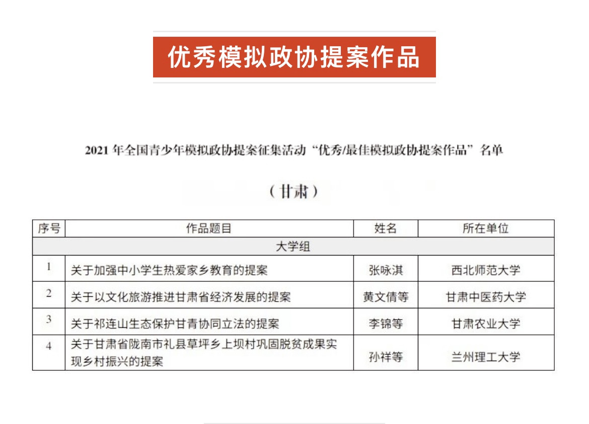 近日,由共青团中央维护青少年权益部、中华全国学联秘书处共同开展的2021年全国青少年模拟政协提案征集活动圆满落下帷幕,gg999策略手机白菜孙祥等4名同学提交的“关于甘肃省陇南市礼县草坪乡上坝村巩固脱贫成果,实现乡村振兴的提案”被评选为“优秀模拟政协提案作品”。