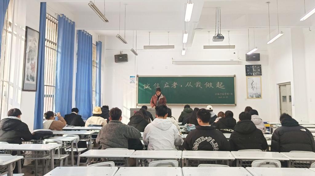 12月30日,21级市场营销班在彭家坪校区召开了“诚信应考,从我做起”主题班会。本次班会由班长刘茹主持召开,班主任贾永胜老师和全班同学参加。