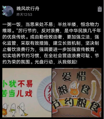 受疫情影响,本次活动依托线上评议选定,参与者于群内发表自身“光盘行动”活动照片,并可自行编辑文案,结合公司相关规定上传至流量平台进行“厉行节约,反对浪费”的宣传。活动受到了同学们的强烈关注,并纷纷晒出了自己的“光盘”照片。权益部为扩大活动影响力,号召更多的同学参与其中,还举办了“QQ空间集赞得礼品活动”,开通了关于厉行节约文学作品征稿渠道,有力地促进了“共创疫尘不染,同养勤俭节约之德”系列主题活动的顺利开展。