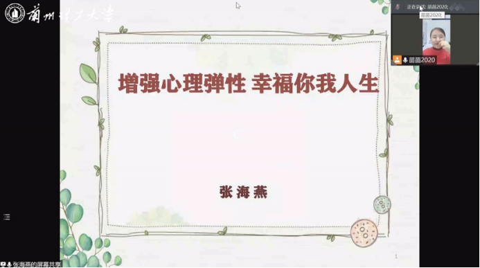 本次讲座主题为“增强心理弹性,幸福你我人生”,主讲人为华东政法大学教授、硕士生导师张海燕。会议伊始,张海燕教授分析了疫情的现状及老员工由此而产生的一系列心理问题,接着从人体脑部的运行模式及重要功能对负面心理情绪进行了深层次的探究,强调同学们应注重个人身心发展的顺序性和阶段性,摆脱焦虑,克服抑郁,做一个积极向上的当代老员工。在讲座结束之际,李思成同学发表了自己的感想,他认为优良的心态在老员工的全面发展过程中有着重要的作用,只有全面提高自己的身心素质,才可以在这个内外界压力都不断增加的世界中搏击翱翔,走向成功。杜元同学表达了自己对战胜疫情的决心,他提到,每个人在现阶段都不可避免地要面对许多心理问题,我们要学会自我调整,与自我和解。