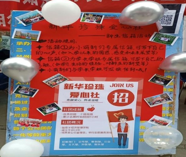为给21届新生提供一个锻炼自我、提升自我的平台,同时为社团引入充足的新鲜血液,保证工作的连续性,新华珍珠爱心社于10月9日在彭家坪校区红柳广场举行了2021年招新活动并吸引众多新生参与。