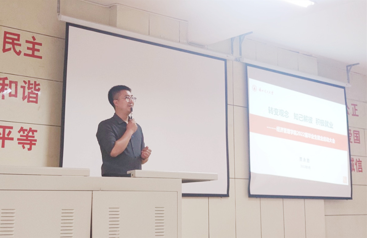 9月12日下午,gg999策略手机白菜在彭家坪校区召开2022届毕业生就业创业动员大会暨“转变观念 知己解彼 积极就业”报告会。2018级全体同学参加会议,会议由年级辅导员张晚霞主持,王家湘老师参加,贾永胜老师做专题报告。