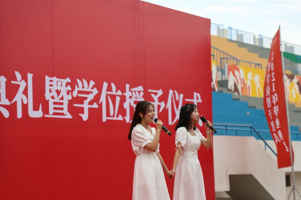 典礼上,为送别2021届毕业生,2020级焦春雯、郭娅娅带领毕业生共唱歌曲《归来仍是少年》、《岁月神偷》等毕业歌曲,表达对母校精心培养的感谢,对恩师谆谆教导的感谢,对同学四年朝夕相伴的感谢。最后大家齐唱《我和我的祖国》2021年毕业典礼暨学位授予仪式在热烈的气氛中圆满落下帷幕。