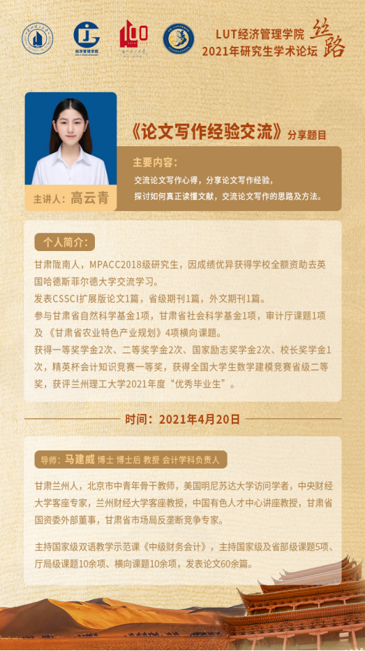 MPAcc2018级研究生高云青,与大家交流论文写作心得,分享论文写作经验,探讨如何真正读懂文献,交流论文写作的思路及方法。高云青在校期间因成绩优异获得公司全额资助去英国哈德斯菲尔德大学交流学习。发表CSSCI扩展版论文1篇,省级期刊1篇,外文期刊1篇。参与甘肃省自然科学基金1项,甘肃省社会科学基金1项,审计厅课题1项及 《甘肃省农业特色产业规划》4项横向课题。获得一等奖学金2次、二等奖学金2次、国家励志奖学金2次、董事长奖学金1次,精英杯会计知识竞赛一等奖,获得全国老员工数学建模竞赛省级二等奖,获评2021年度“优秀毕业生”。