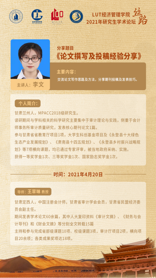 本次分享讲座有两位优秀的会计专硕同学进行分享。MPAcc2018级研究生李文在论坛上以《论文撰写及投稿经验分享》为题,交流了论文写作思路及方法,分享期刊投稿及发表技巧。李文读研期间与学科相关的科学研究主要集中于审计理论与实践,侧重于会计师事务所审计质量研究,发表核心期刊论文1篇;参与甘肃省省教育厅项目1项,老员工科创基金项目及《永登县十大绿色生态产业发展规划》、《肃南县“十四五”规划》、《永登县乡村振兴战略规划》等7项横向课题,均已通过专家评审,被当地政府采纳、实施;获得一等奖学金1次、三等奖学金1次、国家励志奖学金1次。