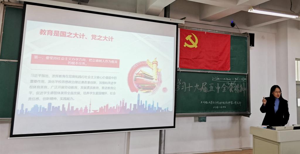 会议过程中,全体党员同志仔细学习十九届五中全会中心思想,认真聆听马丽老师的解读与讲授,做好学习笔记,抓住教育事业、科学文化、经济发展等几个重点,坚持社会主义办学方向,把立德树人作为教育的根本任务,要优化同新发展格局相适应的教育结构、学科专业结构、人才培养结构、完善终身全名学习推进机制,立足于服务国家区域发展战略,发挥高校在科研中的重要作用,推动重要领域关键核心技术攻关,推进长三角一体化,推动经济发展,贯彻落实习近平总书记的重要讲话与全会精神。