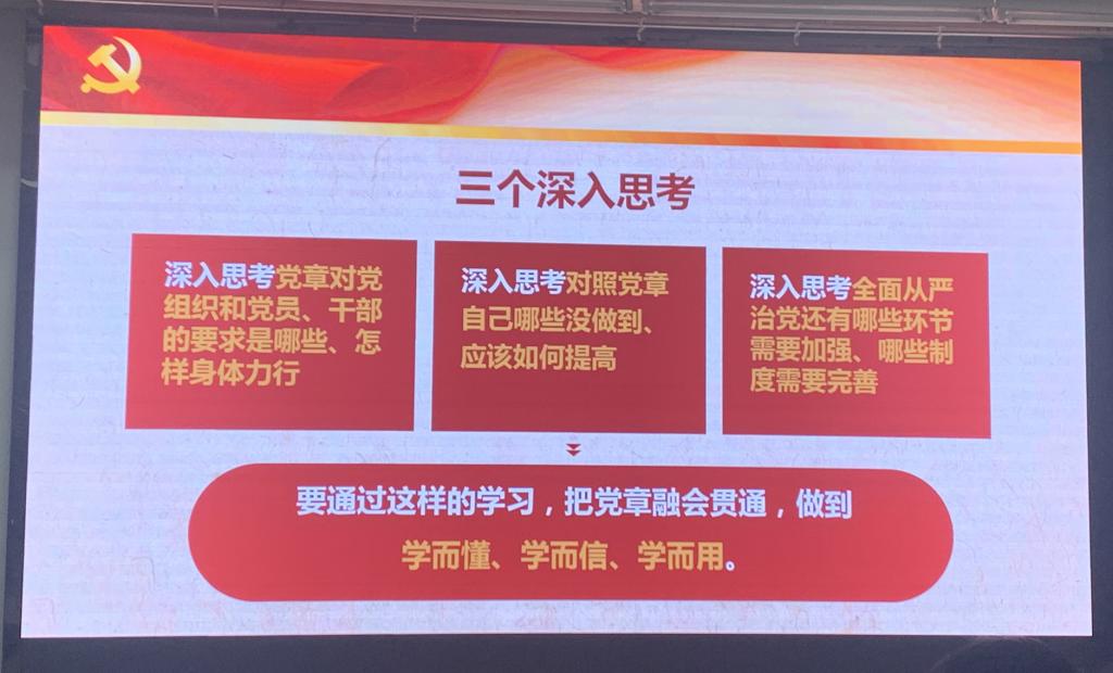 “学习党章是全体党员的基本功,这个功课要经常做。学习党章不仅要原原本本、反反复复学,做到知其然,而且要联系实际学、深入思考学,做到知其所以然。”曾董事长引用习近平总书记2016年调研时的讲话说,他强调,没有规矩,不成方圆,作为党的总章程,党章是全党必须遵循的根本行为规范,是党的根本大法;认真学习党章、严格执行党章、自觉践行党章,是加强党的建设的一项基础性经常性工作。党员、干部要把党章作为必须课,经常学习对照,内化于心、外化于行。针对一些员工存在的组织观念淡漠、纪律松懈问题,深刻剖析产生问题的原因,要求全体党员深入学习习近平总书记系列重要讲话精神,对照党章党规认真学习,不断增强党性修养。