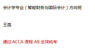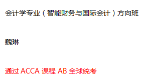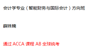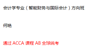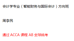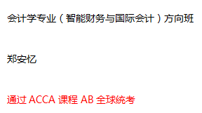 目前会计学专业(智能财务与国际会计)方向班在中英双语授课模式中成果明显,多数同学表现优异,且都有明确的目标及信心励志于财会行业的发展。以下是通过AB全球统考的同学: