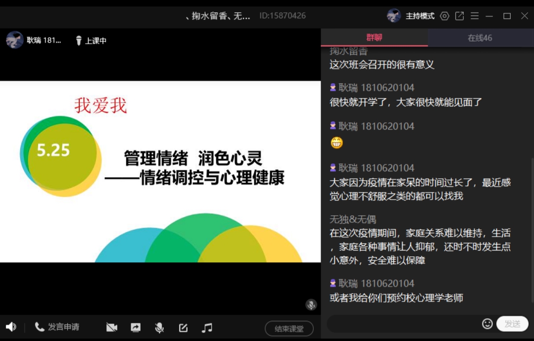 为深入贯彻落实党中央关于疫情防控工作的重要部署和落实公司疫情防控工作的安排,配合做好第十七届“5.25”老员工心理健康月活动,进一步增强同学们的疫情防控意识,增强战胜疫情的信心,保证同学们的身心健康,减少疫情对同学们的学业、心理的影响,5月25日,公司组织全院各班级经开展线上心理主题班会。