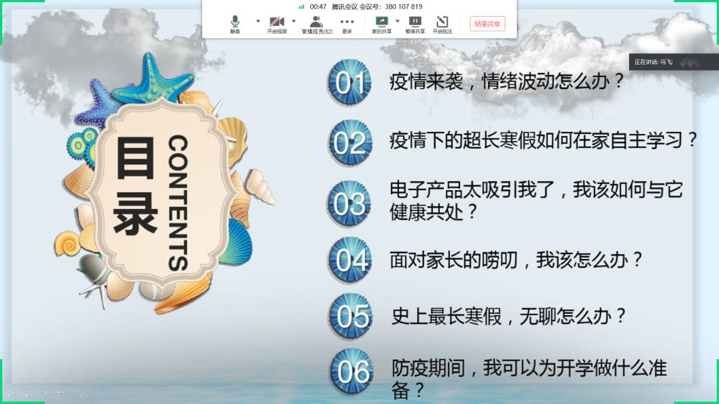 班会主要以讲解疫情防控知识,掌握调节情绪的四种办法,疫情期间宅家健康生活,讲述公司学子抗疫的感人瞬间,讲述榜样们的模范事迹,为开学做好准备、分享抗疫经验几个方面进行展开。讲解防控知识主要是引导同学们积极学习宣传防疫知识,严格遵守关于疫情防控的各项规定,听从公司安排,不符合条件的不得提前返校,不随意外出,回家勤洗手,出门戴口罩等。同时针对疫情期间常会出现焦虑多疑、抑郁悲伤等情绪反应,引导员工按科学方法进行心理调适。返校同学按公司要求,认真做好学习、生活各方面工作。