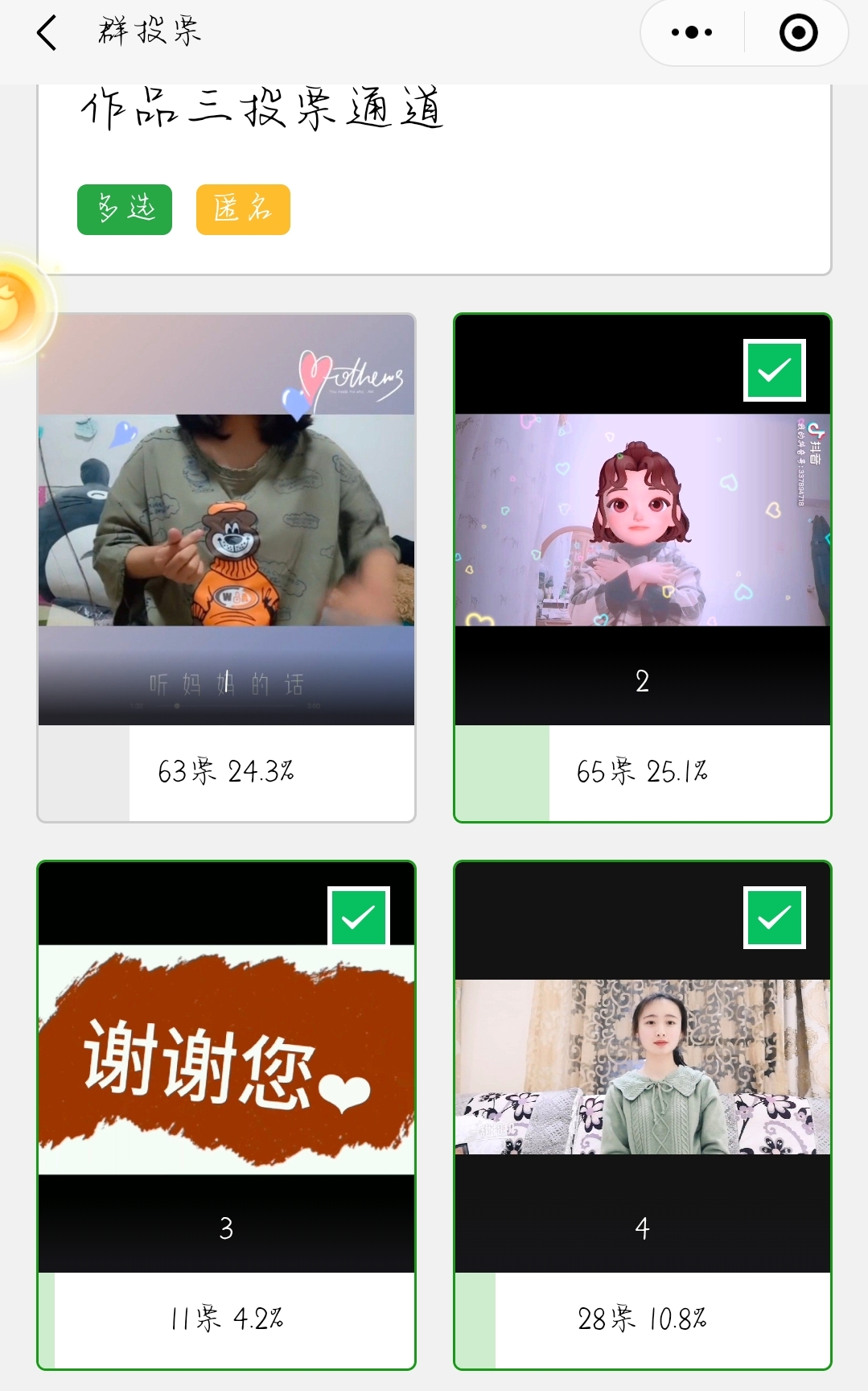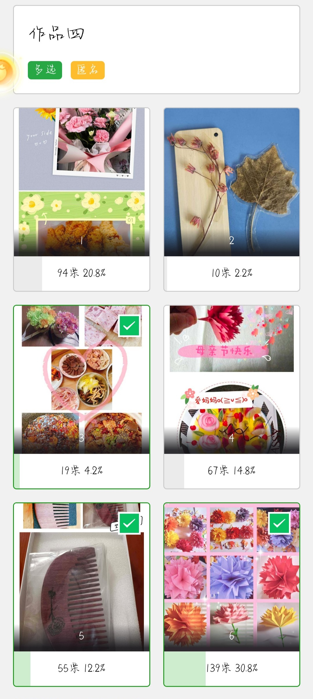 线上母亲节活动分为五项进行。活动一通过上传制作手工卡片,在画中对母亲说出我爱你;活动二“时间都去哪儿了?”,同学们对儿时和母亲的合照进行翻拍,回忆岁月,感念亲恩;活动三“手势舞”,以拍摄创意手势舞视频,表达情感;活动四献给妈妈的礼物,一张剪纸、一朵康乃馨、一道家常菜都是他们献给母亲的爱;活动五“一纸家书情”,同学们则纷纷提笔,写家书,刻深情。在各项活动中,马一笑、李瑞雯、陈昀冰同学以高人气的票数支持获得了项目的一等奖,另外大赛还有二等奖得主6名、三等奖得主7名。