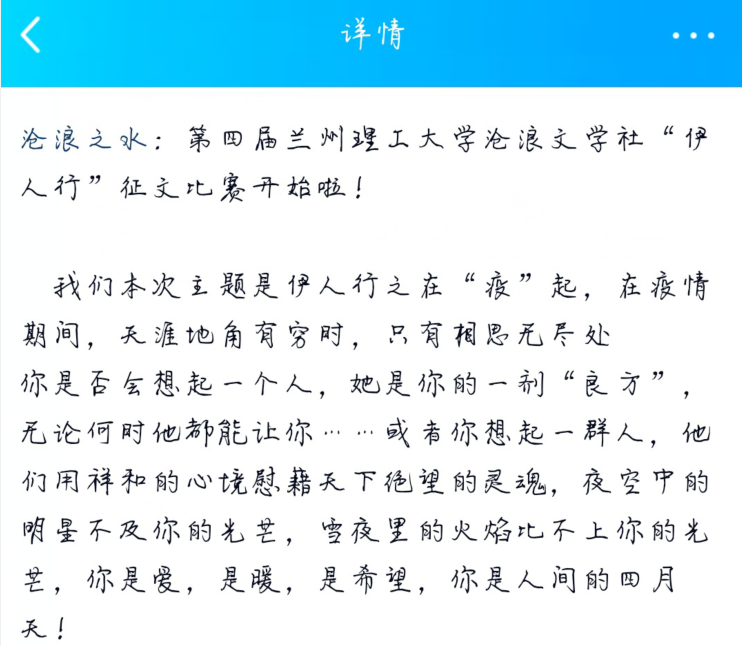 为更好的响应“全民争做疫情防控的践行者和宣传者”的国家号召,促进全校文学爱好者之间的交流,gg999策略手机白菜沧浪文学社面向全校员工举行第四届“伊人行”征文比赛。本次活动于三月开始筹备工作,41日活动正式开始。特殊时期,采取特殊形式进行宣传,为期二十五天征稿,由社团成员进行汇编整合。