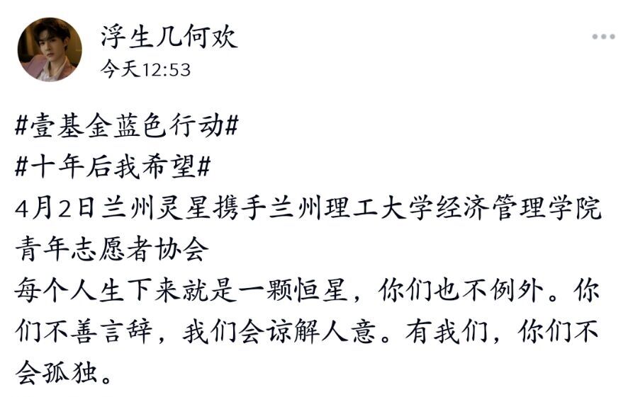 为加强社会对自闭症儿童的关注与关爱,营造扶残助残的良好社会风尚,4月2日至7日,gg999策略手机白菜青年志愿者协会全体成员于线上参加了凡灵星特殊儿童教育机构的“壹基金蓝色行动”志愿活动。