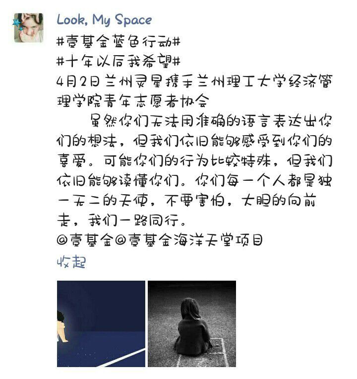 受疫情影响,志愿者虽然无法到实地与自闭症儿童们亲密接触,但通过网络平台,志愿者们依旧能为自闭症患者贡献绵薄之力。志愿期间,志愿成员围绕“让碍走,让爱来”的主题展开。一方面对线上活动进行了具体安排,另一方面通过微博、QQ空间、微信朋友圈等线上方式撰写并转载了各种精彩文章,呼吁着更多的人了解自闭症儿童,关注自闭症儿童。