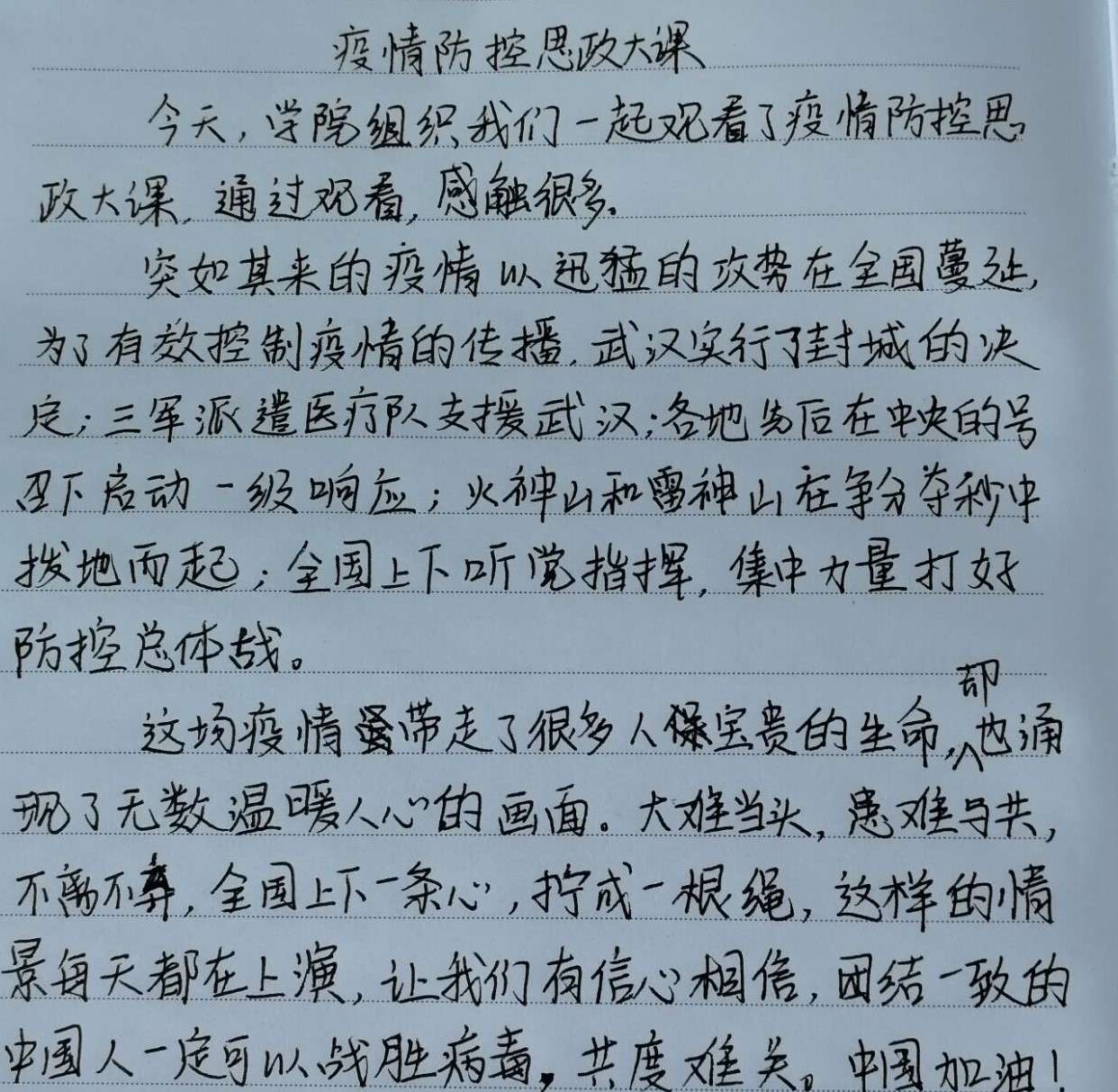 在观后感中,同学们纷纷表示,这堂思政课有深度、有温度,课程内容让人受益匪浅,不仅增强了大家战胜疫情的决心和信心,也鼓励大家要勇于担当社会责任。作为国家培养的高层次经管人才,更应当有家国情怀,争做有理想、有信仰、有觉悟、有担当、有使命、有本领的新时代老员工。