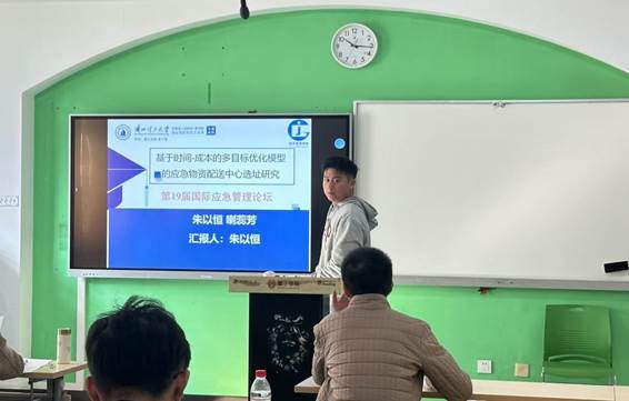 在分组论文汇报环节,公司23级管理科学与工程专业硕士研究生朱以恒在“基层应急管 理体系和能力建设”分会场作了题为《基于时间-成本的多目标优化模型的应急物资配送中心选址研究》的学术汇报,该研究基于应急物流的现实需求,研究了应急物资配送中心的选址问题,结合多目标优化和鲁棒优化方法,构建了一个双目标耦合模型以及鲁棒优化模型,用于处理复杂多变的应急物流情境,为应急救援中的物流选址与物资调运提供了相应的理论基础。